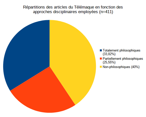 Le second point, très lié au premier, est qu’un même constat peut être fait à l’égard des productions elles-mêmes. Même si la majorité des contributions sont de nature philosophique, nombreuses sont celles qui ne relèvent pas totalement voire pas du tout de la philosophie. Or, si le profil des auteurs ne dit a priori rien de leurs productions, il n’en est pas de même lorsque c’est précisément la nature de ces dernières qui est examinée. Il nous semble que ce constat est plus intéressant que le premier au regard de notre problématique. En effet, si une revue est dite « spécialisée », c’est qu’elle concentre des auteurs au profil sans doute semblable mais pas nécessairement. En revanche, il est difficile de prétendre qu’une revue est « spécialisée » si la diversité des articles qu’elle recueille est telle qu’il est alors difficile de déterminer à quelle discipline elle peut légitimement se rattacher. Si une revue se réclamant de physique quantique édite des articles de chimie organique, de biologie moléculaire voire d’histoire de la physique ou de philosophie des sciences, elle risque fort de perdre son statut de revue crédible aux yeux des physiciens quantiques. En ce qui concerne Le Télémaque en tout cas, nous avons vu que, si une grande majorité d’articles pouvaient être qualifiés de (totalement ou partiellement) philosophiques, 40% pouvaient difficilement recevoir ce qualificatif. Cela représente certes moins de la moitié des productions examinées mais non seulement la proportion reste élevée et c’est sans évoquer le caractère « hybride » de nombreuses publications philosophiques...