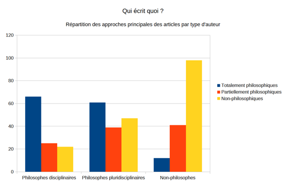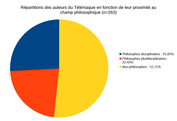 Nous avons déjà pu noter l’hétérogénéité des contributeurs. Si les philosophes sont les plus nombreux, ils ne représentent pas non plus une écrasante majorité. Près de la moitié des auteurs ne sont de toute évidence pas des philosophes18 . En outre, parmi les auteurs comptabilisés comme « philosophe », un nombre conséquent consacre ou a consacré une part importante de son temps à travailler sur des sujets, des problèmes, des approches… annexes à la philosophie. Ce que cela signifie, c’est qu’une partie de leur temps a été dédiée à l’exploration de sujet non philosophiques, c’est-à-dire, au fond à l’élargissement de leur spectre de connaissance et de compétence, plutôt qu’à l’approfondissement de leur connaissance philosophique (potentiellement déjà importante). Ce que je veux souligner ici, c’est donc une triple hétérogénéité chez les auteurs du Télémaque : des auteurs au profil éminemment philosophique, des auteurs au profil philosophique mais également psychologique, sociologique, historien, praticien… et des auteurs au profil non philosophique.